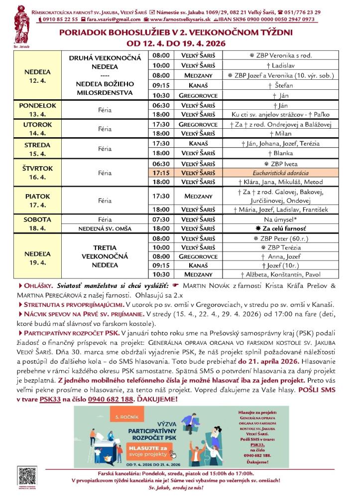 Poriadok bohoslužieb a farské oznamy v 2. veľkonočnom týždni od 12. 4. 2026 do 19. 4. 2026