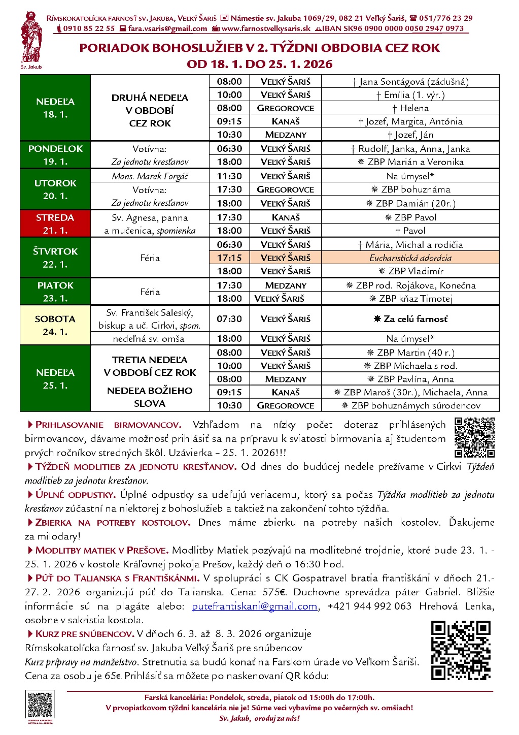 Poriadok bohoslužieb a farské oznamy v 2. týždni obdobia Cez rok od 18. 1. 2026 do 25. 1. 2026