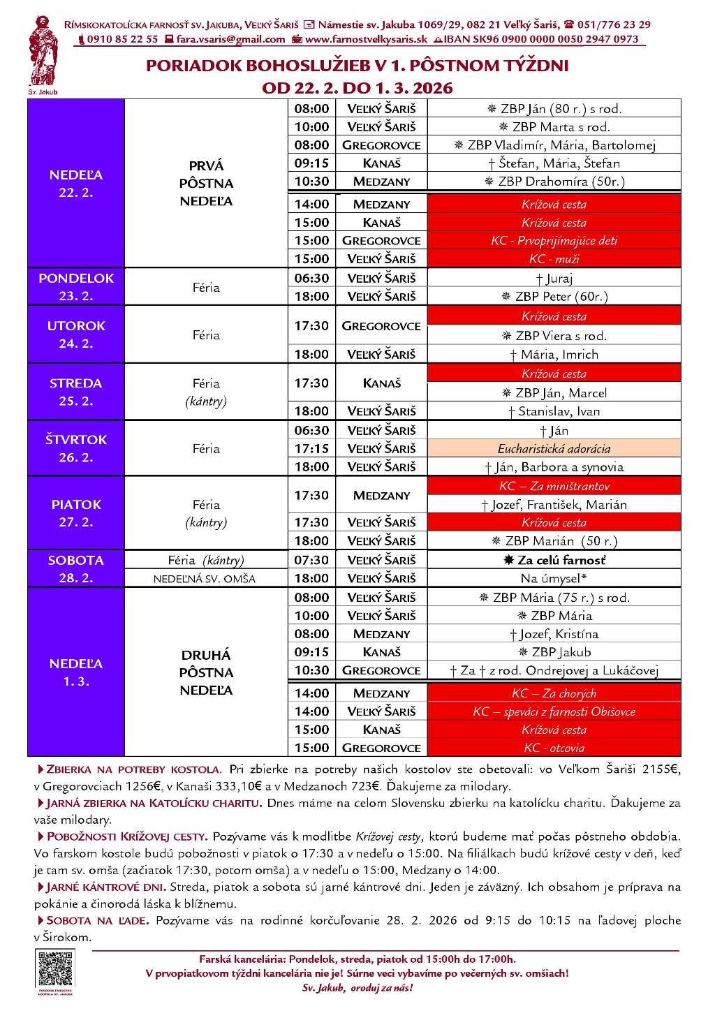 Poriadok bohoslužieb a farské oznamy v 1. pôstnom týždni od 22. 2. 2026 do 1. 3. 2026