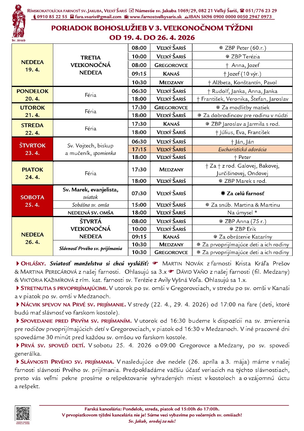 Poriadok bohoslužieb a farské oznamy v 3. veľkonočnom týždni od 19. 4. 2026 do 26. 4. 2026