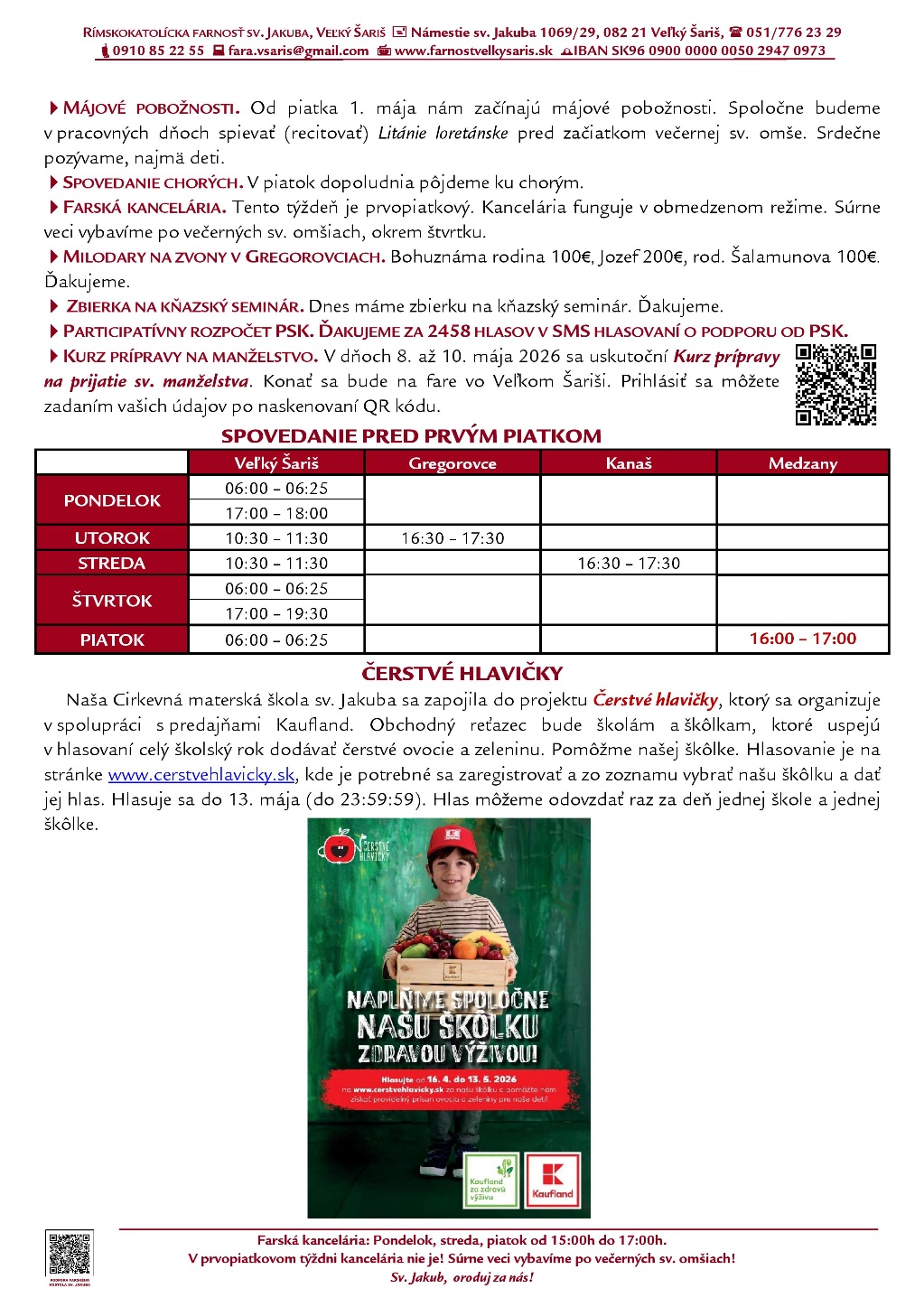 Poriadok bohoslužieb a farské oznamy vo 4. veľkonočnom týždni od 26. 4. 2026 do 3. 5. 2026