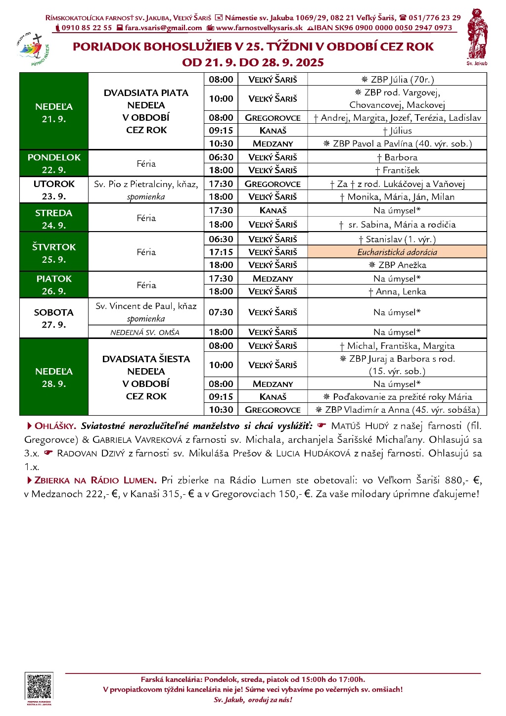 Poriadok bohoslužieb a farské oznamy v 24. týždni obdobia Cez rok od 21. 9. do 28. 9. 2025