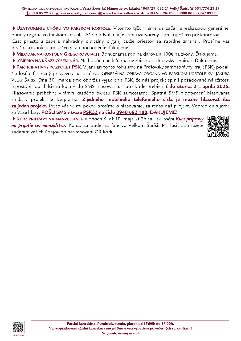 Poriadok bohoslužieb a farské oznamy v 3. veľkonočnom týždni od 19. 4. 2026 do 26. 4. 2026