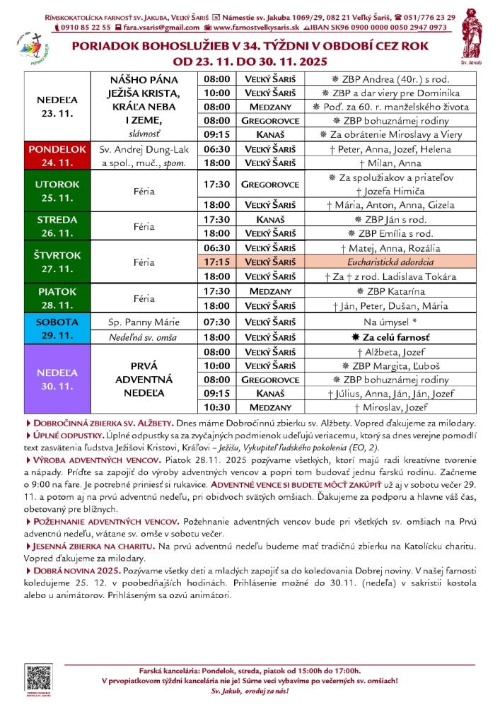 Poriadok bohoslužieb a farské oznamy v 34. týždni obdobia Cez rok od 23. 11. do 30. 11. 2025